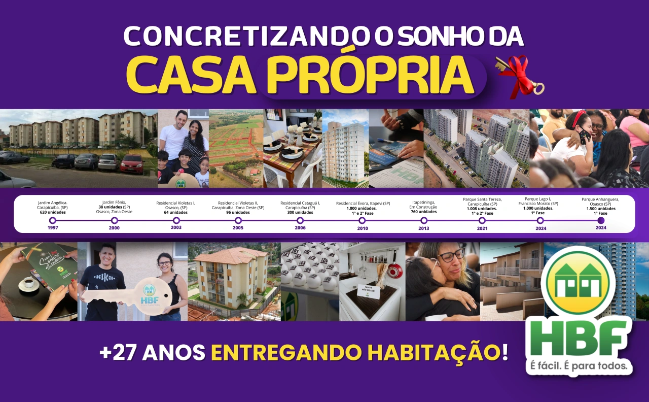 A HBF já realizou o sonho da casa própria para 2.600 famílias e continua crescendo! Nossos empreendimentos estão em Carapicuíba, Itapevi, Osasco e Francisco Morato, oferecendo moradia acessível, com infraestrutura completa, conforto e segurança.